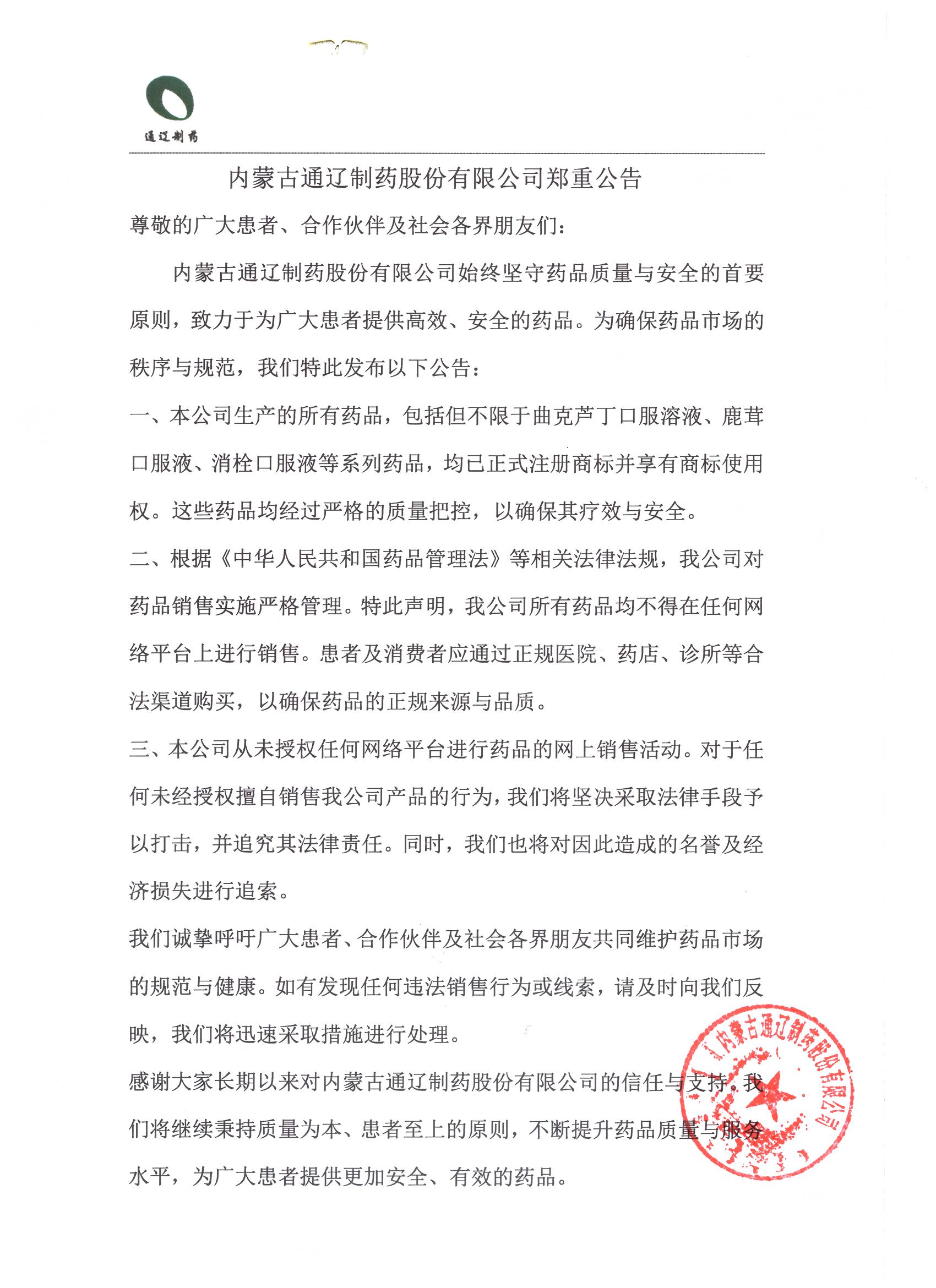 內(nèi)蒙古通遼制藥股份有限公司 網(wǎng)址:www.17ok.com.cn 地址:內(nèi)蒙古自治區(qū)通遼市中心大街196號 電話:銷售部:0475-6383522 業(yè)務(wù)部:0475-6383542 生產(chǎn)及質(zhì)量部:0475-6383524 郵箱:497889758@qq.co...